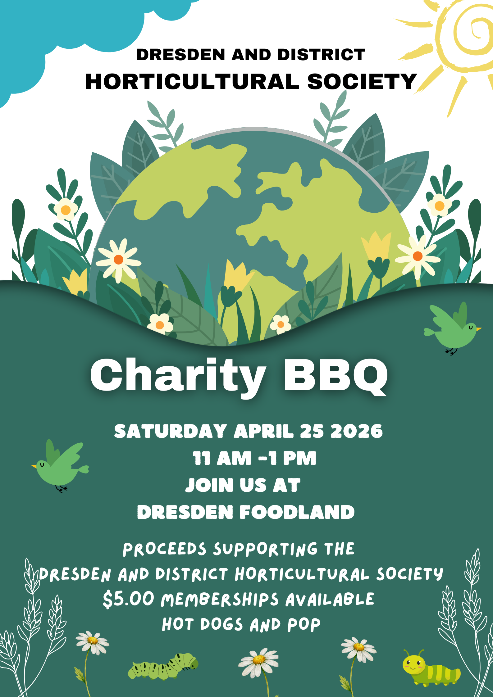 A Membership Drive and BBQ will be held on Saturday April 25, from 11am to 1 pm at Dresden Foodland. Memberships will be sold for $5.00 each. With the sale of 200 memberships the Horticultural Society qualifies for a government grant. The funds are used to purchase flowers and maintain the gardens. Everyone welcome to join us for a hot dog pop!